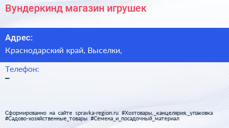 Вундеркинд, магазин игрушек по адресу Краснодарский край, Выселки, в дальнейшем Организация, размещена в следующих категориях: