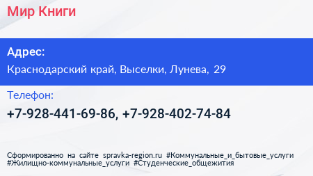 Мир Книги по адресу Краснодарский край, Выселки, Лунева, 29 в дальнейшем Организация, размещена в следующих категориях: