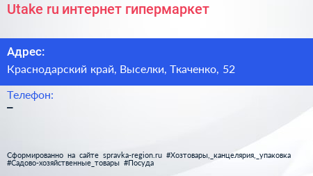 Utake.ru, интернет-гипермаркет по адресу Краснодарский край, Выселки, Ткаченко, 52 в дальнейшем Организация, размещена в следующих категориях: