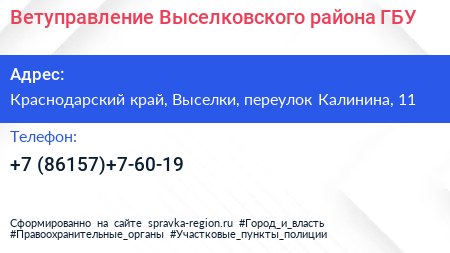 Ветуправление Выселковского района, ГБУ по адресу Краснодарский край, Выселки, переулок Калинина, 11 в дальнейшем Организация, размещена в следующих категориях: