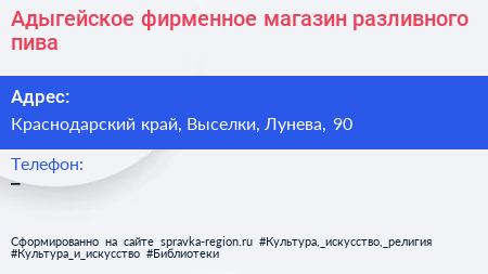 Адыгейское фирменное, магазин разливного пива по адресу Краснодарский край, Выселки, Лунева, 90 в дальнейшем Организация, размещена в следующих категориях: