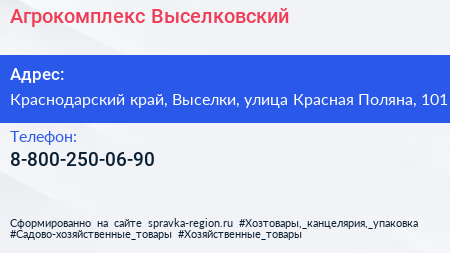 Агрокомплекс Выселковский по адресу Краснодарский край, Выселки, улица Красная Поляна, 101 в дальнейшем Организация, размещена в следующих категориях: