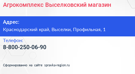Агрокомплекс Выселковский, магазин по адресу Краснодарский край, Выселки, Профильная, 1 в дальнейшем Организация, размещена в следующих категориях: