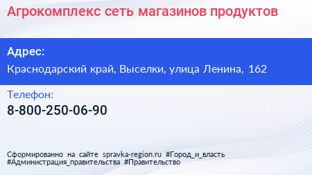 Агрокомплекс, сеть магазинов продуктов по адресу Краснодарский край, Выселки, улица Ленина, 162 в дальнейшем Организация, размещена в следующих категориях: