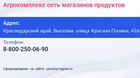 Агрокомплекс, сеть магазинов продуктов по адресу Краснодарский край, Выселки, улица Красная Поляна, 426 в дальнейшем Организация, размещена в следующих категориях: