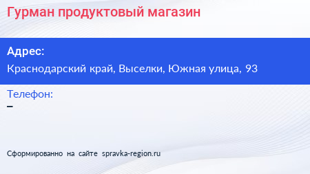 Гурман, продуктовый магазин по адресу Краснодарский край, Выселки, Южная улица, 93 в дальнейшем Организация, размещена в следующих категориях: