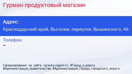 Гурман, продуктовый магазин по адресу Краснодарский край, Выселки, переулок Вышинского, 46 в дальнейшем Организация, размещена в следующих категориях: