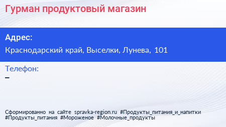 Гурман, продуктовый магазин по адресу Краснодарский край, Выселки, Лунева, 101 в дальнейшем Организация, размещена в следующих категориях: