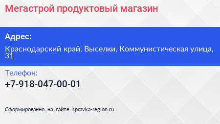 Мегастрой, продуктовый магазин по адресу Краснодарский край, Выселки, Коммунистическая улица, 31 в дальнейшем Организация, размещена в следующих категориях: