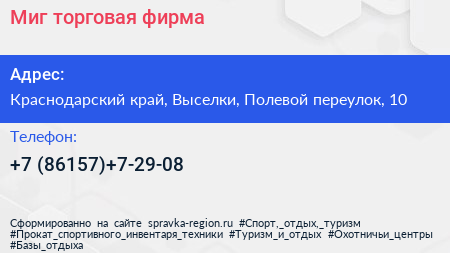 Миг, торговая фирма по адресу Краснодарский край, Выселки, Полевой переулок, 10 в дальнейшем Организация, размещена в следующих категориях: