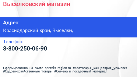 Выселковский, магазин по адресу Краснодарский край, Выселки, в дальнейшем Организация, размещена в следующих категориях: