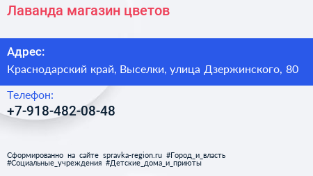 Лаванда, магазин цветов по адресу Краснодарский край, Выселки, улица Дзержинского, 80 в дальнейшем Организация, размещена в следующих категориях: