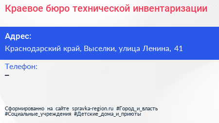 Краевое бюро технической инвентаризации по адресу Краснодарский край, Выселки, улица Ленина, 41 в дальнейшем Организация, размещена в следующих категориях:
