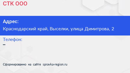 СТК, ООО по адресу Краснодарский край, Выселки, улица Димитрова, 2 в дальнейшем Организация, размещена в следующих категориях: