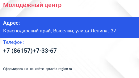 Молодёжный центр по адресу Краснодарский край, Выселки, улица Ленина, 37 в дальнейшем Организация, размещена в следующих категориях: