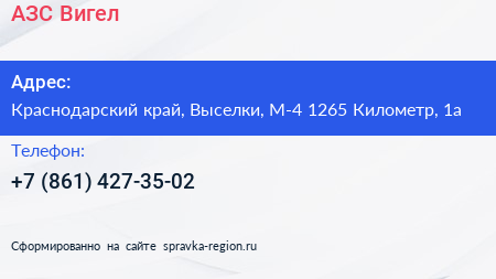 АЗС, Вигел по адресу Краснодарский край, Выселки, М-4 1265 Километр, 1а в дальнейшем Организация, размещена в следующих категориях: