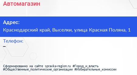 Автомагазин по адресу Краснодарский край, Выселки, улица Красная Поляна, 1 в дальнейшем Организация, размещена в следующих категориях: