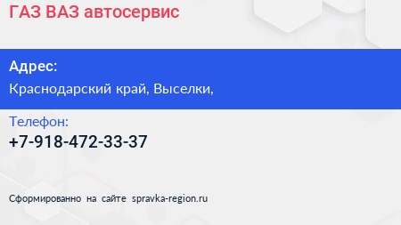 ГАЗ ВАЗ, автосервис по адресу Краснодарский край, Выселки, в дальнейшем Организация, размещена в следующих категориях:
