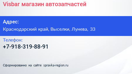Visbar, магазин автозапчастей по адресу Краснодарский край, Выселки, Лунева, 33 в дальнейшем Организация, размещена в следующих категориях: