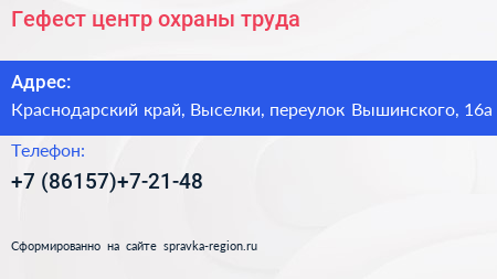 Гефест, центр охраны труда по адресу Краснодарский край, Выселки, переулок Вышинского, 16а в дальнейшем Организация, размещена в следующих категориях: