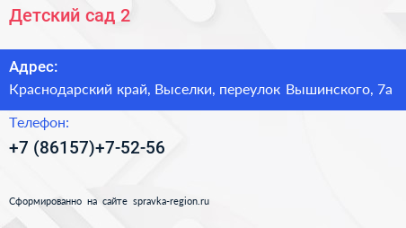 Детский сад №2 по адресу Краснодарский край, Выселки, переулок Вышинского, 7а в дальнейшем Организация, размещена в следующих категориях: