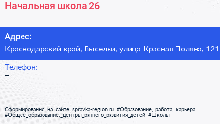Начальная школа №26 по адресу Краснодарский край, Выселки, улица Красная Поляна, 121 в дальнейшем Организация, размещена в следующих категориях: