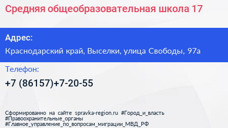Средняя общеобразовательная школа №17 по адресу Краснодарский край, Выселки, улица Свободы, 97а в дальнейшем Организация, размещена в следующих категориях: