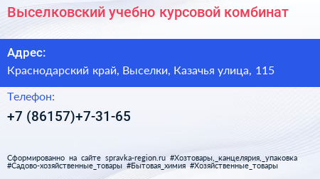 Выселковский, учебно-курсовой комбинат по адресу Краснодарский край, Выселки, Казачья улица, 115 в дальнейшем Организация, размещена в следующих категориях: