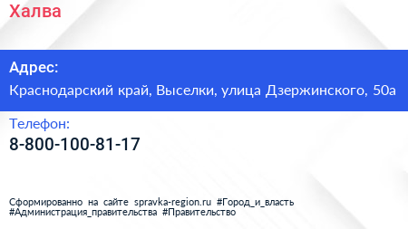 Халва по адресу Краснодарский край, Выселки, улица Дзержинского, 50а в дальнейшем Организация, размещена в следующих категориях:
