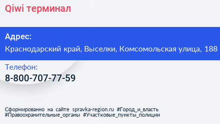 Qiwi, терминал по адресу Краснодарский край, Выселки, Комсомольская улица, 188 в дальнейшем Организация, размещена в следующих категориях: