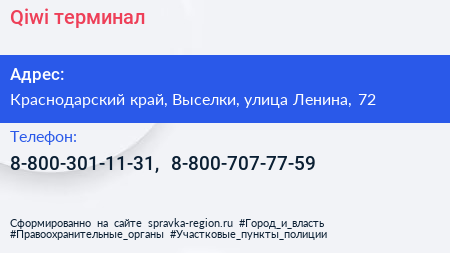 Qiwi, терминал по адресу Краснодарский край, Выселки, улица Ленина, 72 в дальнейшем Организация, размещена в следующих категориях: