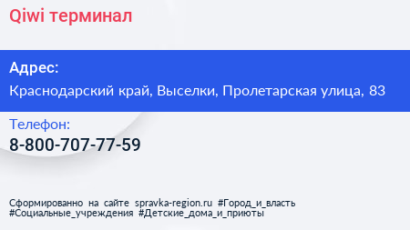 Qiwi, терминал по адресу Краснодарский край, Выселки, Пролетарская улица, 83 в дальнейшем Организация, размещена в следующих категориях: