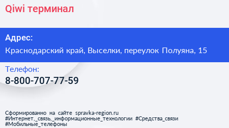 Qiwi, терминал по адресу Краснодарский край, Выселки, переулок Полуяна, 15 в дальнейшем Организация, размещена в следующих категориях: