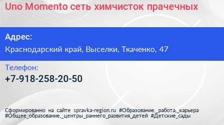 Uno Momento, сеть химчисток-прачечных по адресу Краснодарский край, Выселки, Ткаченко, 47 в дальнейшем Организация, размещена в следующих категориях: