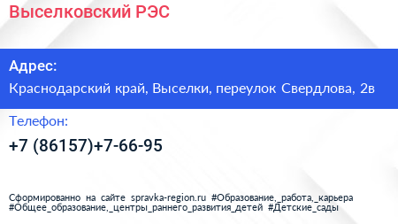Адрес: Краснодарский край, Выселки, переулок Свердлова, 2