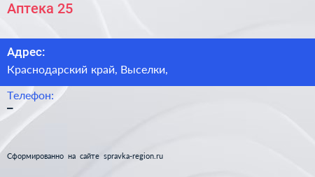 Аптека №25 по адресу Краснодарский край, Выселки, в дальнейшем Организация, размещена в следующих категориях: