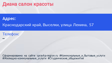 Диана, салон красоты по адресу Краснодарский край, Выселки, улица Ленина, 57 в дальнейшем Организация, размещена в следующих категориях: