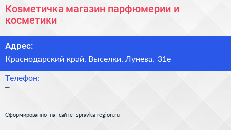 Коsметичка, магазин парфюмерии и косметики по адресу Краснодарский край, Выселки, Лунева, 31е в дальнейшем Организация, размещена в следующих категориях: