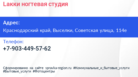 Lакки, ногтевая студия по адресу Краснодарский край, Выселки, Советская улица, 114е в дальнейшем Организация, размещена в следующих категориях:
