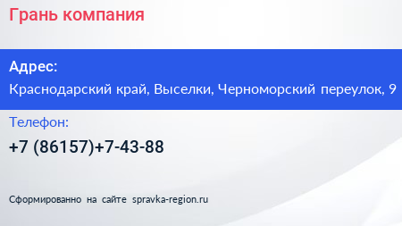Грань, компания по адресу Краснодарский край, Выселки, Черноморский переулок, 9 в дальнейшем Организация, размещена в следующих категориях: