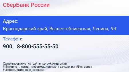 СберБанк России по адресу Краснодарский край, Вышестеблиевская, Ленина, 94 в дальнейшем Организация, размещена в следующих категориях: