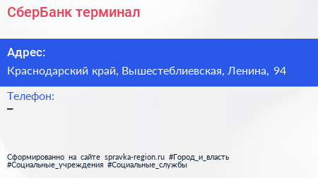 СберБанк, терминал по адресу Краснодарский край, Вышестеблиевская, Ленина, 94 в дальнейшем Организация, размещена в следующих категориях: