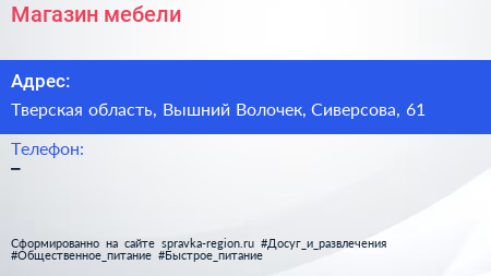 Магазин мебели по адресу Тверская область, Вышний Волочек, Сиверсова, 61 в дальнейшем Организация, размещена в следующих категориях: