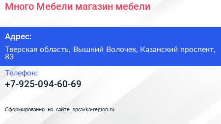 Много Мебели, магазин мебели по адресу Тверская область, Вышний Волочек, Казанский проспект, 83 в дальнейшем Организация, размещена в следующих категориях: