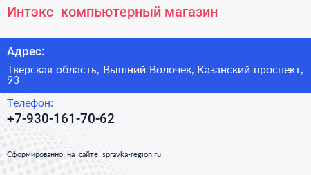 Интэкс+, компьютерный магазин по адресу Тверская область, Вышний Волочек, Казанский проспект, 93 в дальнейшем Организация, размещена в следующих категориях: