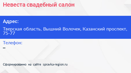Невеста, свадебный салон по адресу Тверская область, Вышний Волочек, Казанский проспект, 75-77 в дальнейшем Организация, размещена в следующих категориях:
