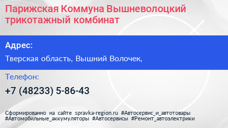 Парижская Коммуна, Вышневолоцкий трикотажный комбинат по адресу Тверская область, Вышний Волочек, в дальнейшем Организация, размещена в следующих категориях: