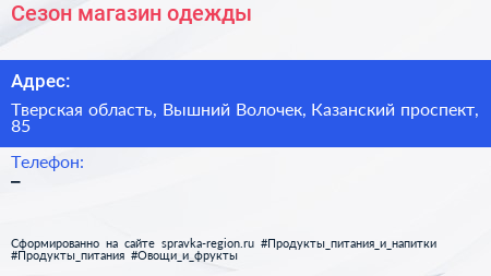Сезон, магазин одежды по адресу Тверская область, Вышний Волочек, Казанский проспект, 85 в дальнейшем Организация, размещена в следующих категориях: