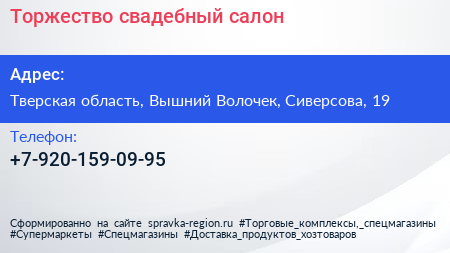 Торжество, свадебный салон по адресу Тверская область, Вышний Волочек, Сиверсова, 19 в дальнейшем Организация, размещена в следующих категориях: