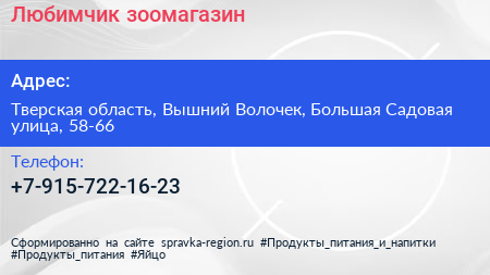 Любимчик, зоомагазин по адресу Тверская область, Вышний Волочек, Большая Садовая улица, 58-66 в дальнейшем Организация, размещена в следующих категориях: